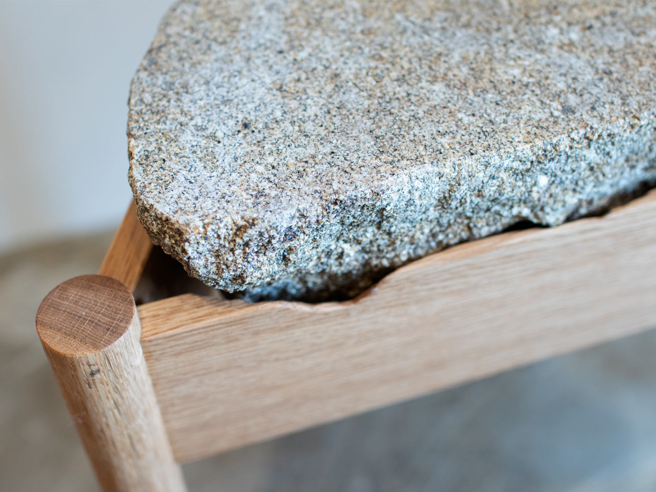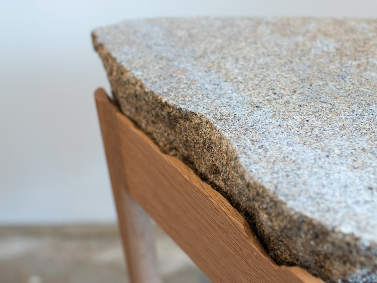 自然石を半分に割ったような大きい石をオークのフレームにはめ込んだサイドテーブル。