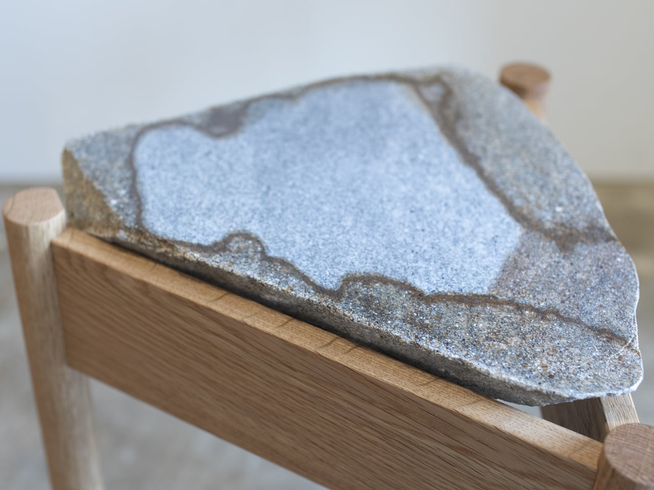 自然石を半分に割ったような大きい石をオークのフレームにはめ込んだサイドテーブル。