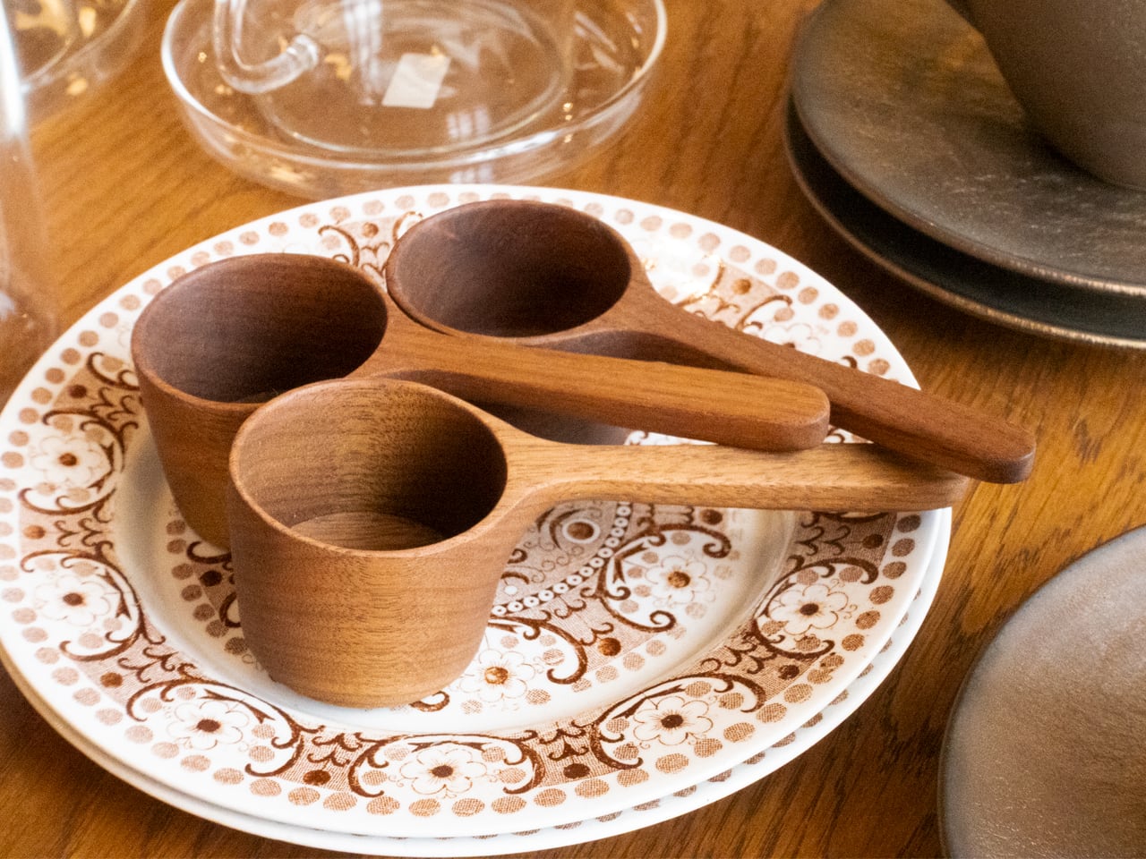 ウォルナットのやさしい質感と、無駄のない佇まい。手に取るとすっと馴染み、自然と所作まで整えてくれるような道具です。縁は薄く、豆をすくいやすいかたちに。