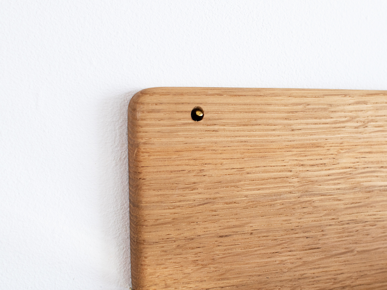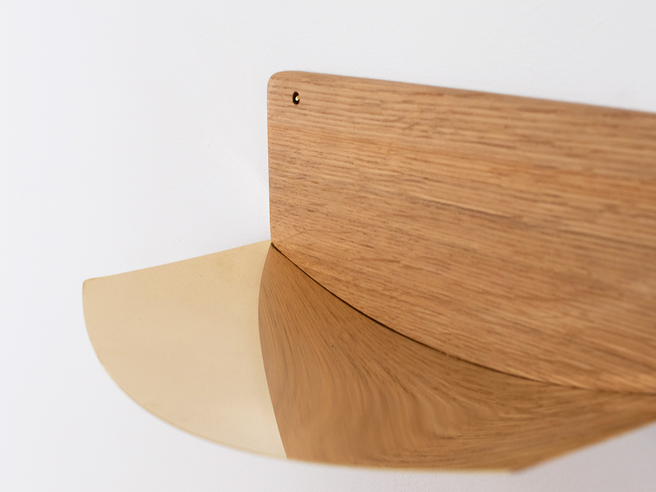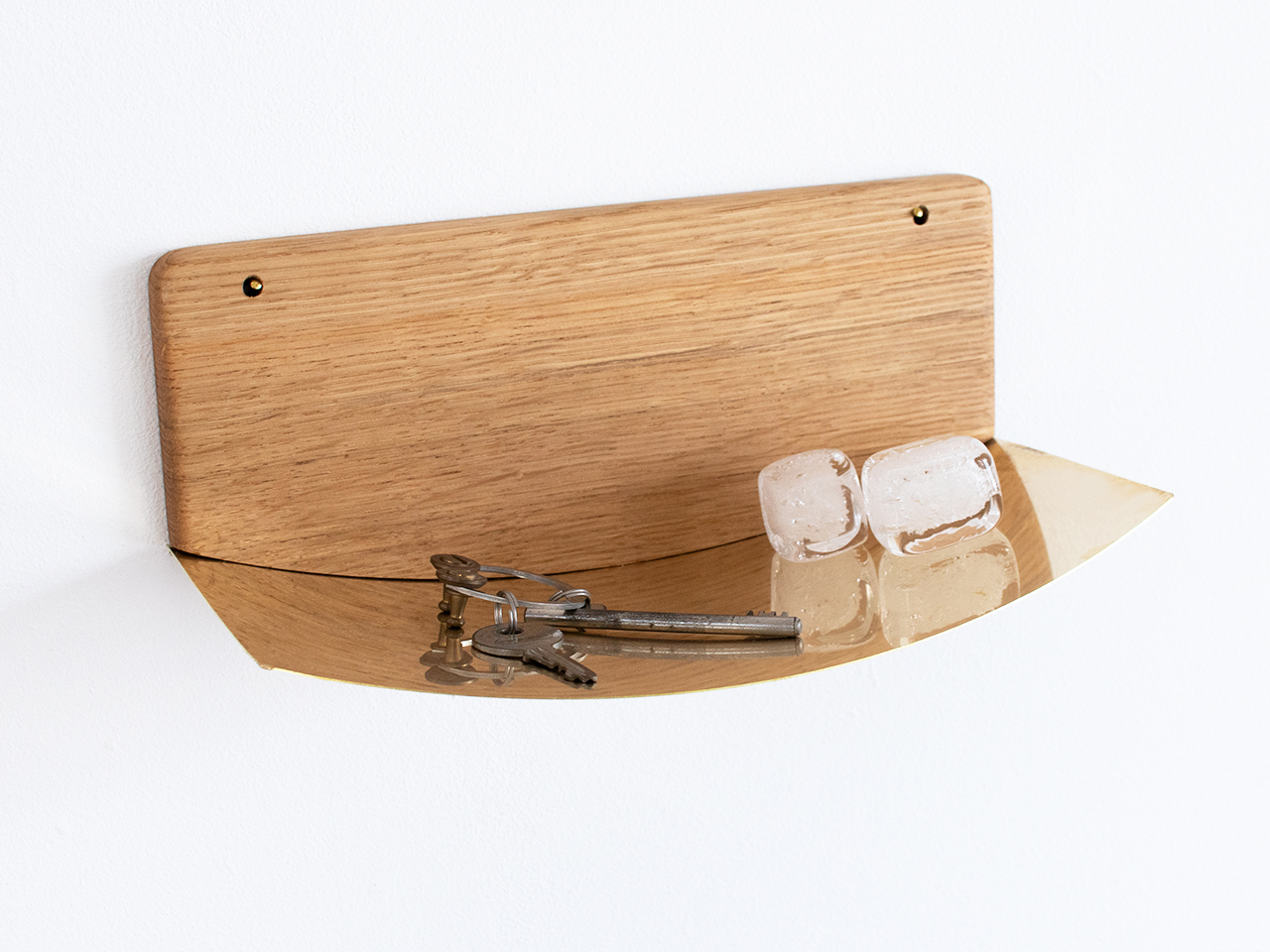 薄い真鍮の板を少し曲げてオークのベースに取り付けたシェルフ