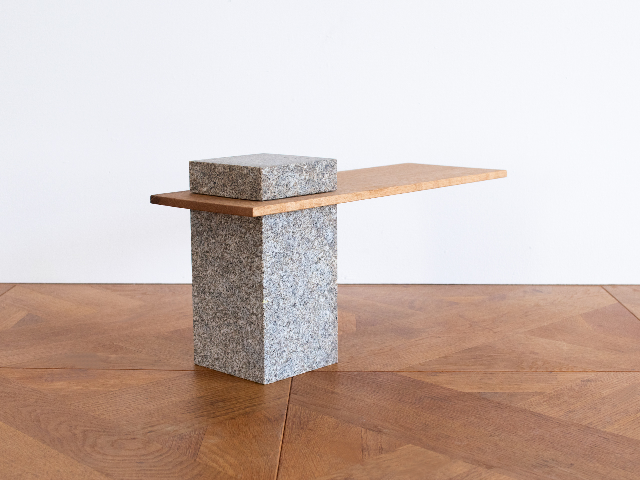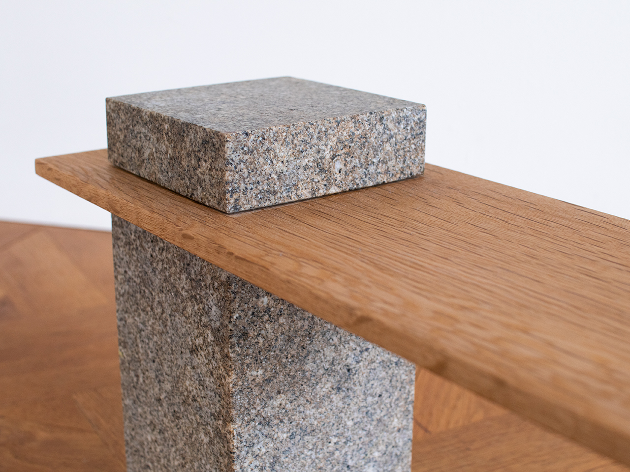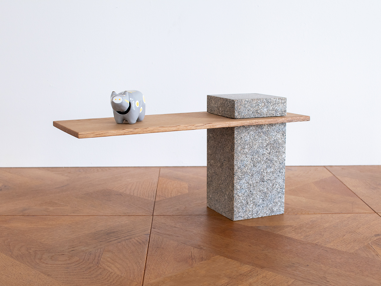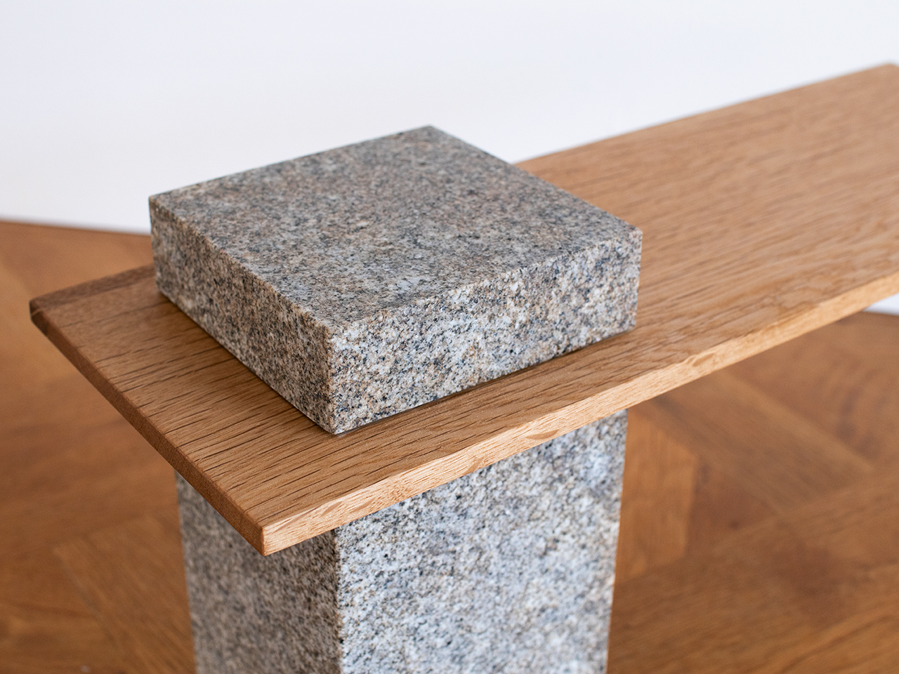 庵治石のブロックがオークの板を貫通しているような意匠のオブジェのような、ひな壇のような、不思議なプロダクト