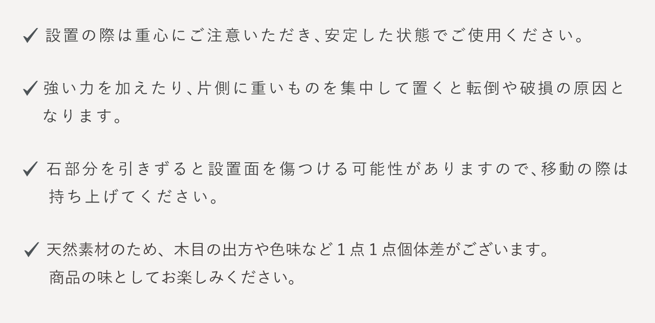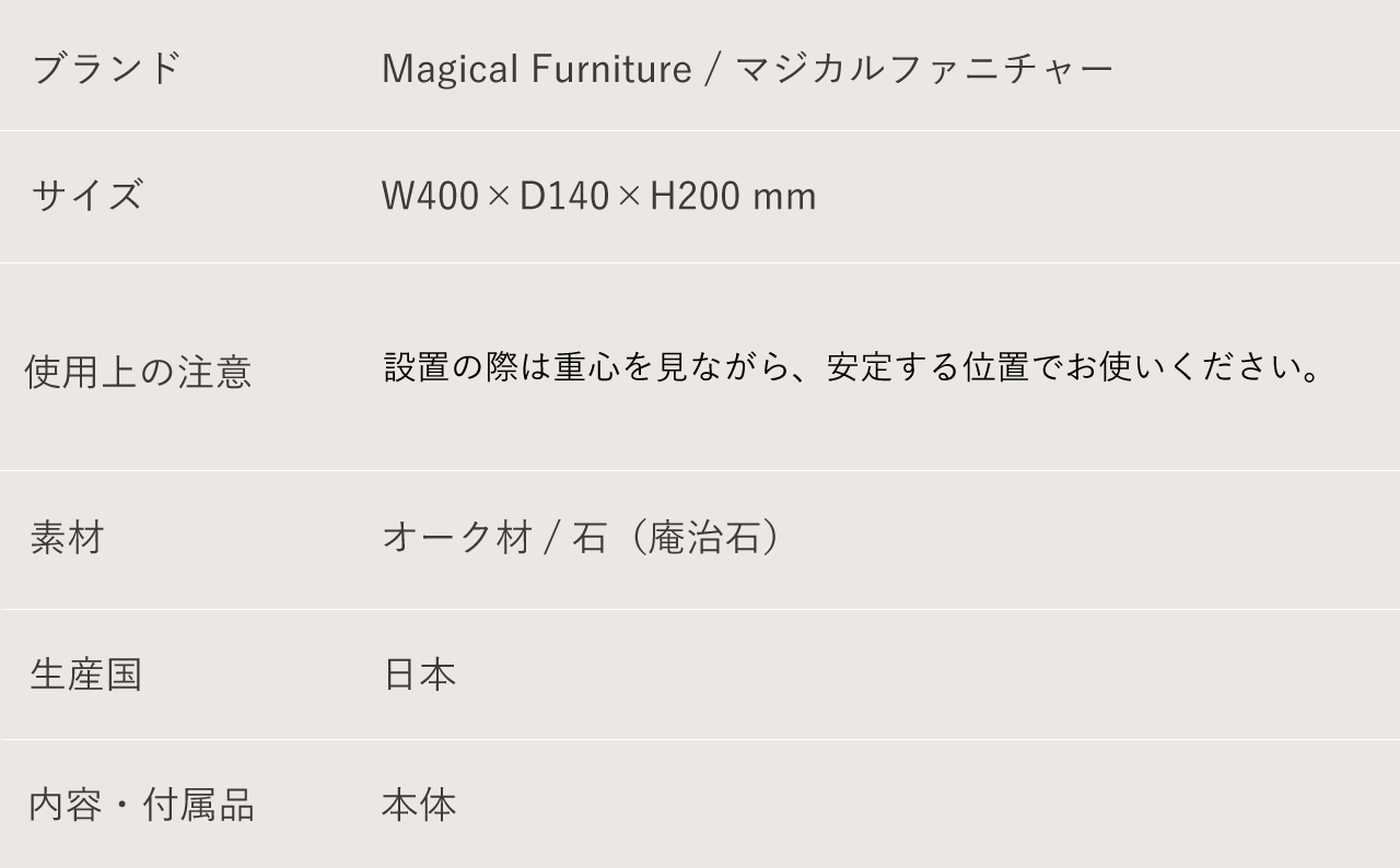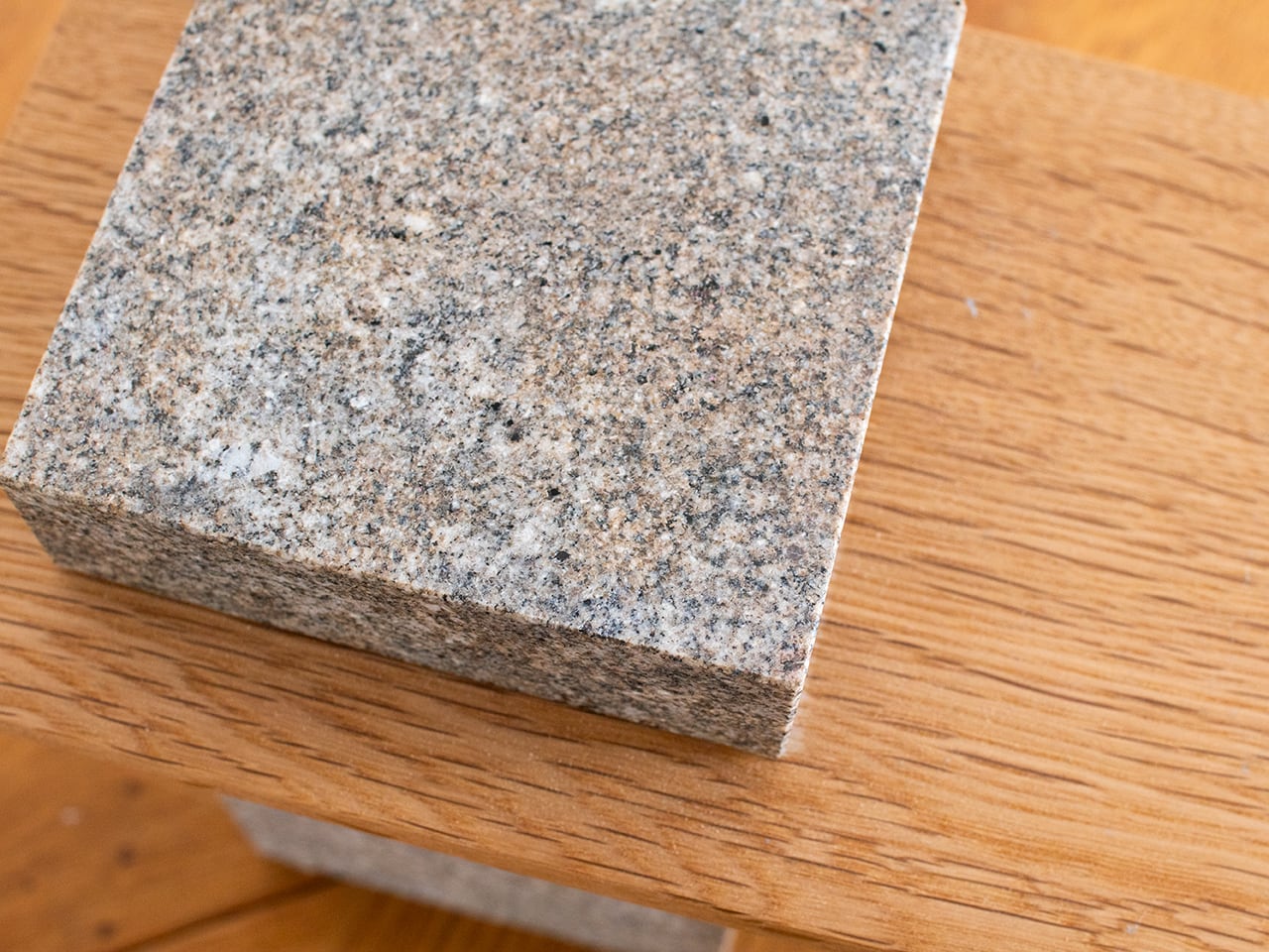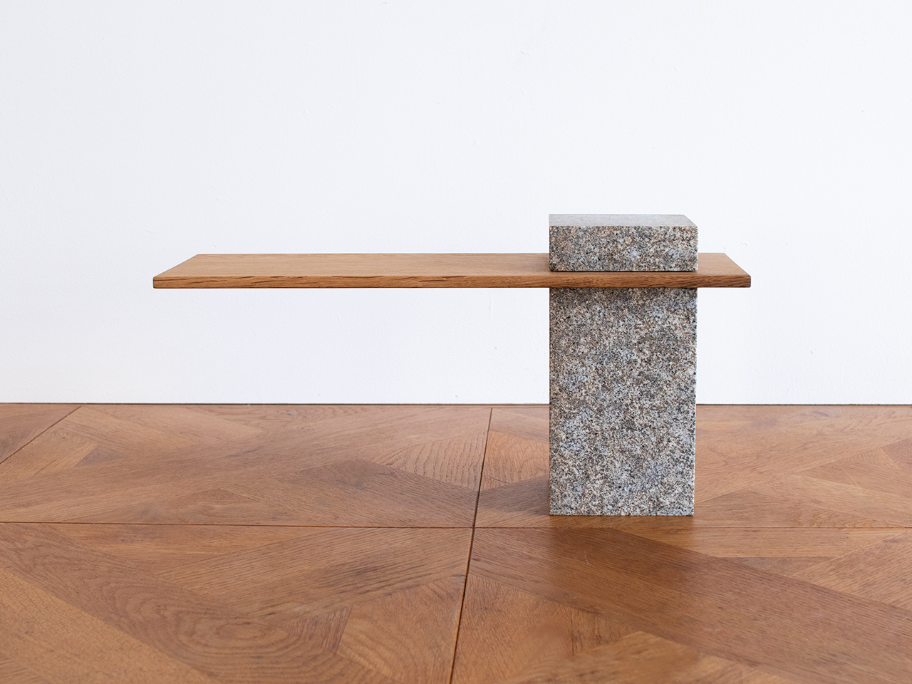 庵治石のブロックがオークの板を貫通しているような意匠のオブジェのような、ひな壇のような、不思議なプロダクト
