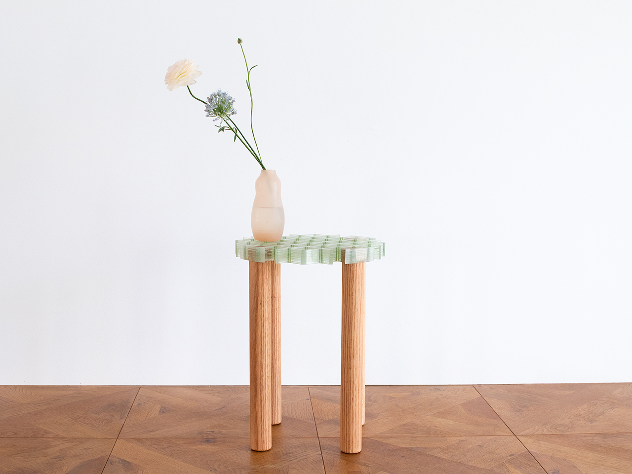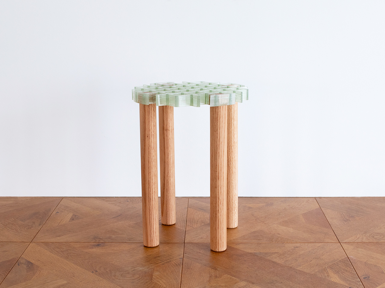 半透明のメッシュから木の脚が生えているような不思議な印象を受ける。